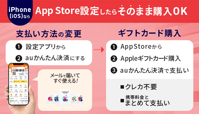 iPhone(iOS)を利用している場合、App Storeアプリの支払い方法を「auかんたん決済(キャリア決済)」に設定することで、Appleギフトカードを購入できます。