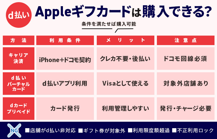 結論から言うと、条件を満たせばd払いを使ってAppleギフトカードを購入できます。