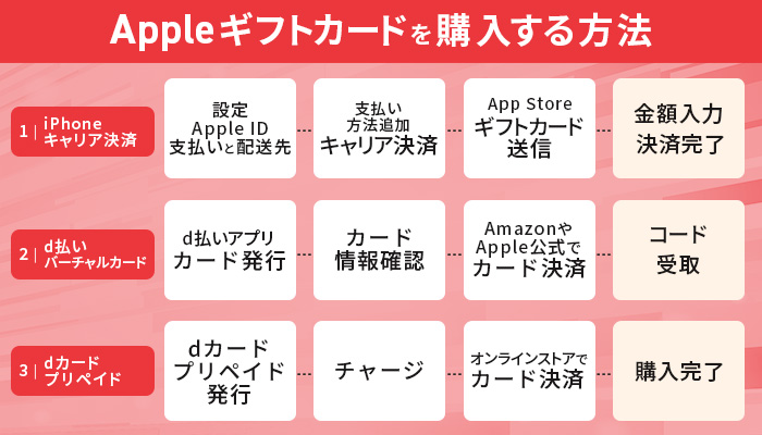 d払いでAppleギフトカードを購入する方法は、主に次の3つがあります。