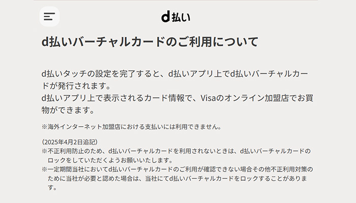 この方法は、d払いアプリから発行できる「Visaバーチャルカード」を利用する方法です。